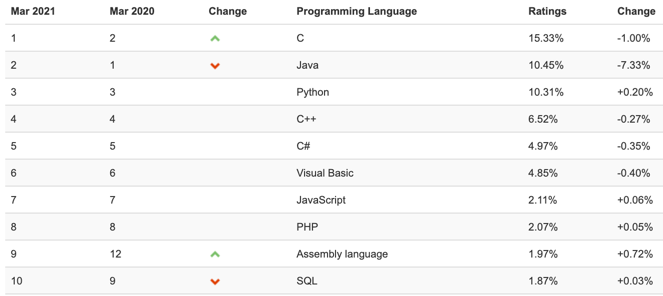 TIOBE编程语言排行榜是我们常说的世界编程语言排行榜,这个由三方厂商和广大程序员创立的排行榜极具权威性。虽然发的有些晚,但是积云教育IT培训的老师还是想和大家分享一下2021年3月TIOBE编程语言排行榜数据,并且对此说说我的看法。