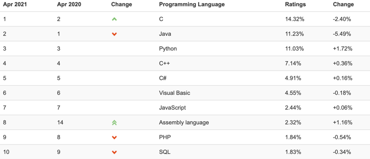 TIOBE编程语言排行榜是编程语言流行趋势的一个指标,每月更新,这份排行榜排名基于互联网有经验的程序员、课程和第三方厂商的数量,能够直观反映出市场、使用者对于语言的需求变化。2021年4月份TIOBE编程排行榜于日前发布,下面北京IT培训的老师就来带着大家了解一下有哪些变化吧。